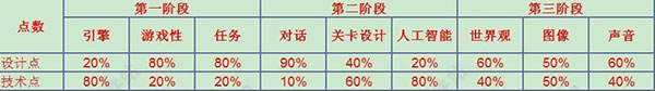 玩游戏的小伙伴们都知道,决定游戏销量最重要的就是评分,有时候虽然游戏比较好玩,但是评分很低的话,销量也不会好,现实中似乎不也是这样吗。其中游戏评分是一个隐藏参数,衡量的指标是设计和技术的分配。其实每个阶段都隐藏了设计点和技术点的数值,上万的数值技术你分配时候隐藏数值计算起来的结果。下面是每个阶段的设计点,技术点的具体隐藏比例: