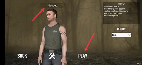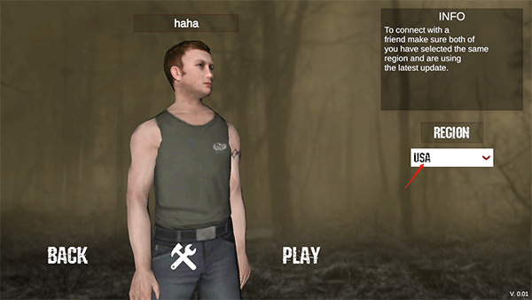 2、需在人物上方取好昵称才会显示PLAY,右方有地区选择,联机需处于同一区域