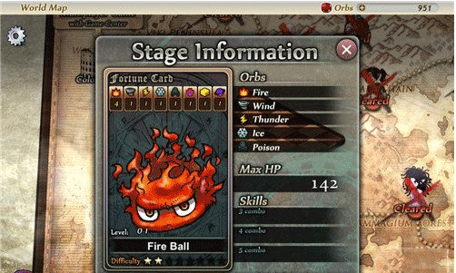 这第一关是2星火球怪,关卡的主要属性为火、风、雷电、冰、毒等5个属性,而这个火球的主要攻击属性是火属性,在游戏中的时候就要小心红色棋子。而且怪物的属性就代表着这一关的主要棋子是哪些属性的,所以我们可以在关卡开始之前把装备更换好,这样才能百战百胜。