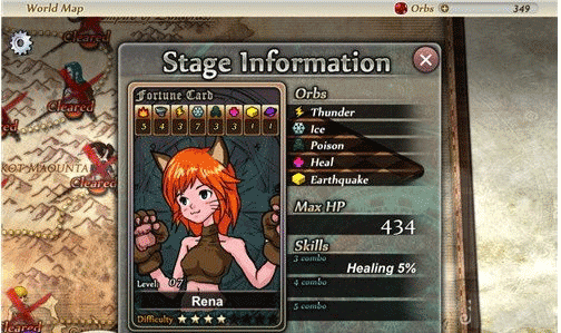 第六关是Rena,主要属性为雷电、冰、毒、回复、土等5个元素,Rena的主要属性冰、火两种较为突出,而且Rena的血量相对来说非常少,可以轻松秒掉,但是他的3combo(连击)技能为healing5%(回复加5%),会老给自己回血的哈!
