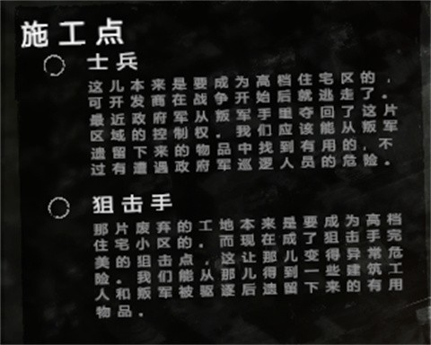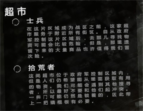 剧情一:狙击手,有两个士兵,一个拿狙击枪,一个拿步枪,第一次去的时候地下室不能下去,要等第二次去的时候带上一个锯子,右边三楼有一个上锁的柜子。大量的电子元件与药品,还有食物,物资比较丰富。