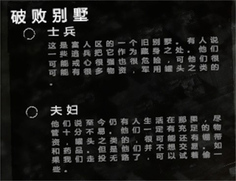 剧情一:地图介绍显示危险(Danger)醉酒大兵调戏女孩,不要犹豫,带上武器弄死他,一把步枪+20子弹+酒,全家满足。地下室有两个锁,一个土堆,材料和食物较多,零件跟电子元件也不少。