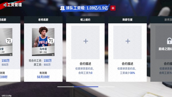 游戏内还提供了“工资管理”系统,点击右上角“+”可以进入,在这里,你可以和球员签订各种特殊合约,以降低你的球员工资。从而在有限的工资帽内,组建一支实力更强的队伍。不同合约需要用到“帽上续约卡”、“降薪引援卡”、“金额中产卡”、“老将底薪卡”等资源,具体资源获取。