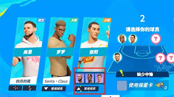 (2)匹配成功后选择球员与11分赛不同,各位巨星需要匹配进入巅峰赛后,再进行球员选择。此外,各位巨星可以看到队友的位置选择,同一球员无法被重复选择,当到达传奇巨星段位,会开启征召模式,届时比赛双方需要轮流选球员,需要注意合理搭配阵容。