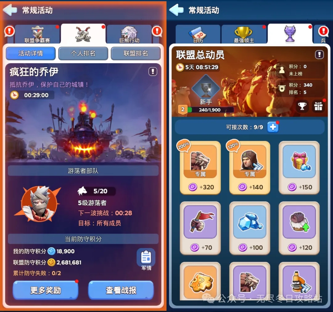 4.全军出击:开服25天后开启;活动内容是伤兵;撞城最快,但是容易死兵;撞矿比较慢,但是消耗少